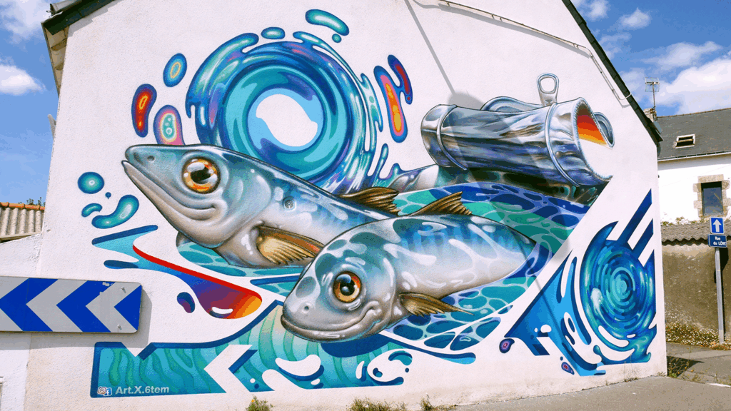 À l’honneur deux joyeuses sardines, emblème de la ville et son identité liée au monde de la pêche, qui surgissent de leur boîte. Elles jouent avec les lieux en reprenant les motifs de signalisation routière.