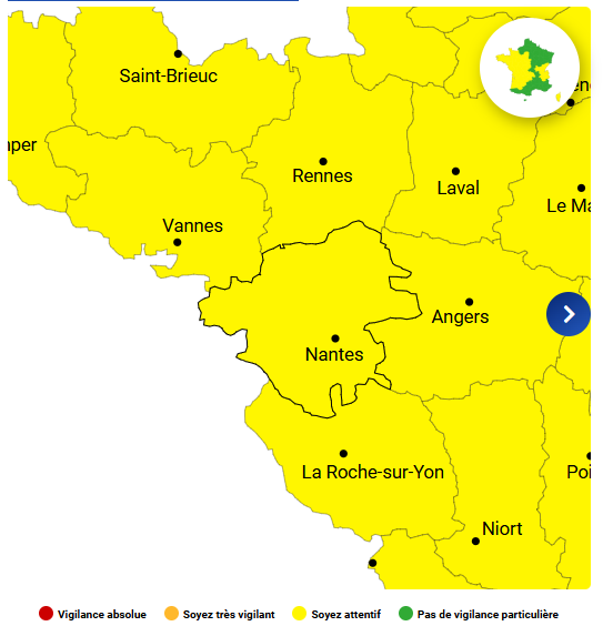La Loire-Atlantique est placée en vigilance jaune pour plusieurs phénomènes météorologiques :